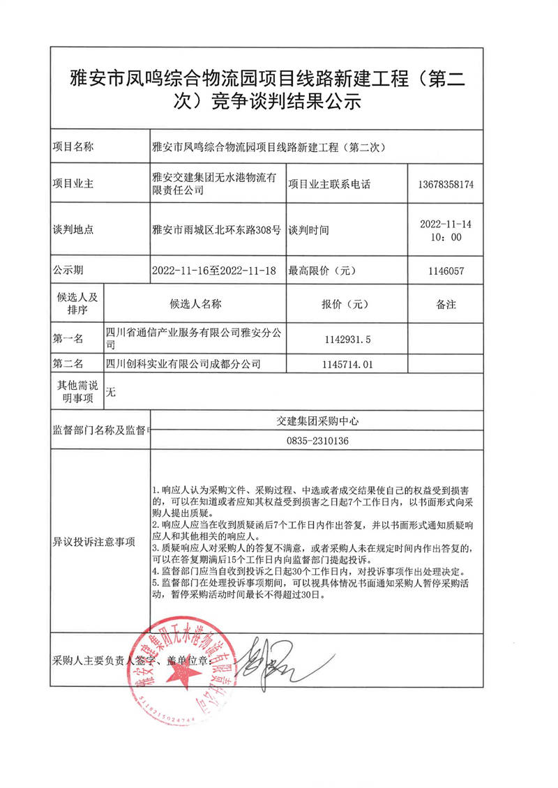 雅安交建集團無水港物流有限責任公司雅安市鳳鳴綜合物流園項目線路新建工程(第二次)競爭談判結(jié)果公示