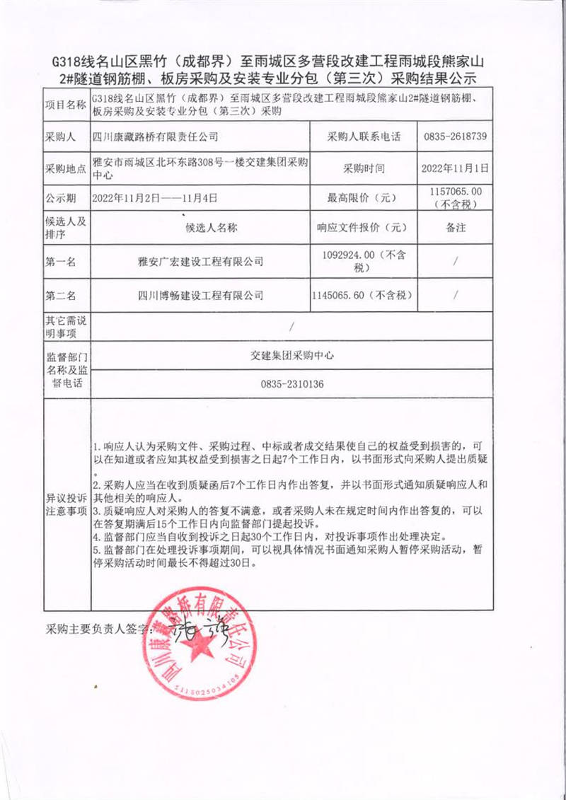 四川康藏路橋有限責任公司G318線名山區(qū)黑竹(成都界)至雨城區(qū)多營段改建工程雨城段熊家山2#隧道鋼筋棚、板房采購及安裝專業(yè)分包(第三次)采購結果公示