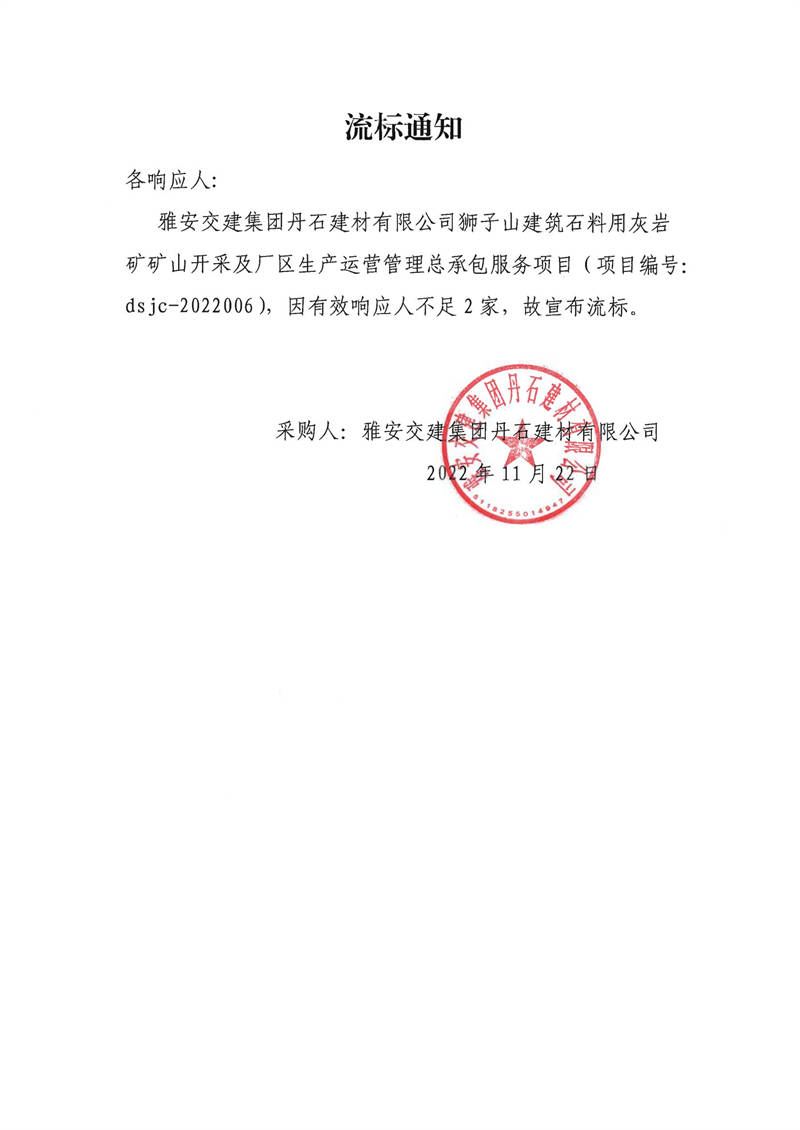 雅安交建集團(tuán)丹石建材有限公司獅子山建筑石料用灰?guī)r礦礦山開采及廠區(qū)生產(chǎn)運(yùn)營(yíng)管理總承包服務(wù)項(xiàng)目采購(gòu)流標(biāo)通知