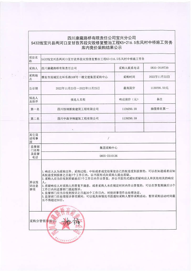 四川康藏路橋有限責任公司寶興分公司S432線寶興縣兩河口至甘孜界段災毀修復整治工程K5+216.5東風村中橋施工勞務庫內(nèi)競價采購結(jié)果公示