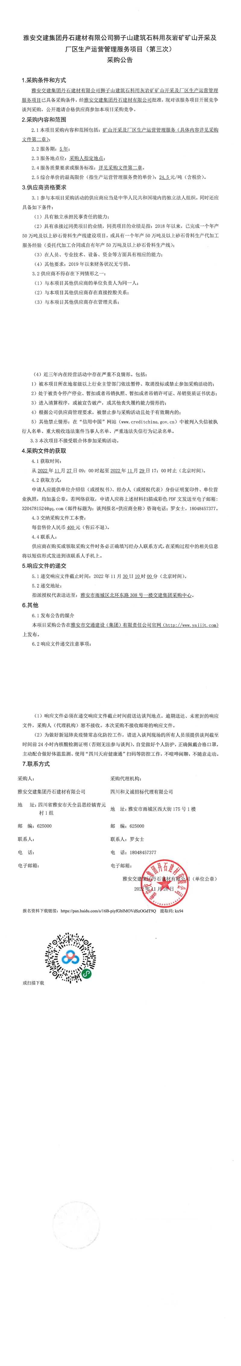 雅安交建集團(tuán)丹石建材有限公司獅子山建筑石料用灰?guī)r礦礦山開(kāi)采及廠區(qū)生產(chǎn)運(yùn)營(yíng)管理服務(wù)項(xiàng)目(第三次)采購(gòu)公告