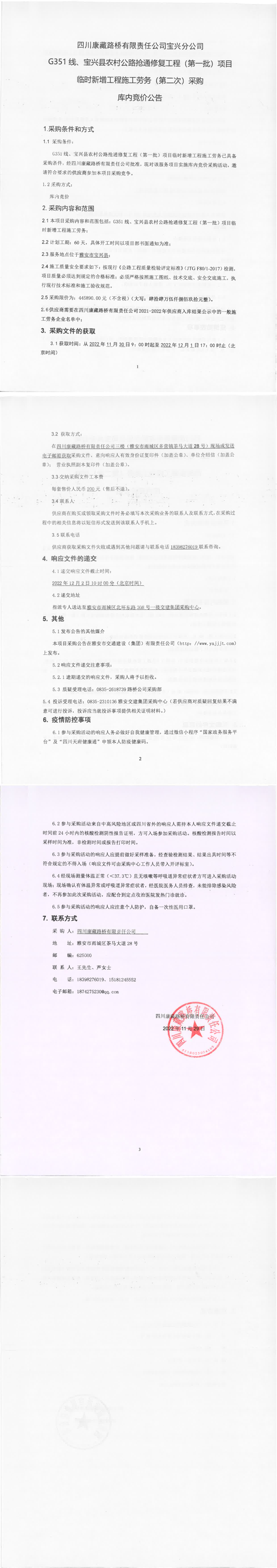 四川康藏路橋有限責(zé)任公司G351線、寶興縣農(nóng)村公路搶通修復(fù)工程(第一批)項目臨時新增工程施工勞務(wù)(第二次)采購庫內(nèi)競價公告