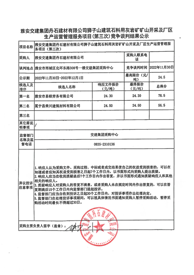 雅安交建集團丹石建材有限公司獅子山建筑石料用灰?guī)r礦礦山開采及廠區(qū)生產運營管理服務項目(第三次)競爭談判結果公示