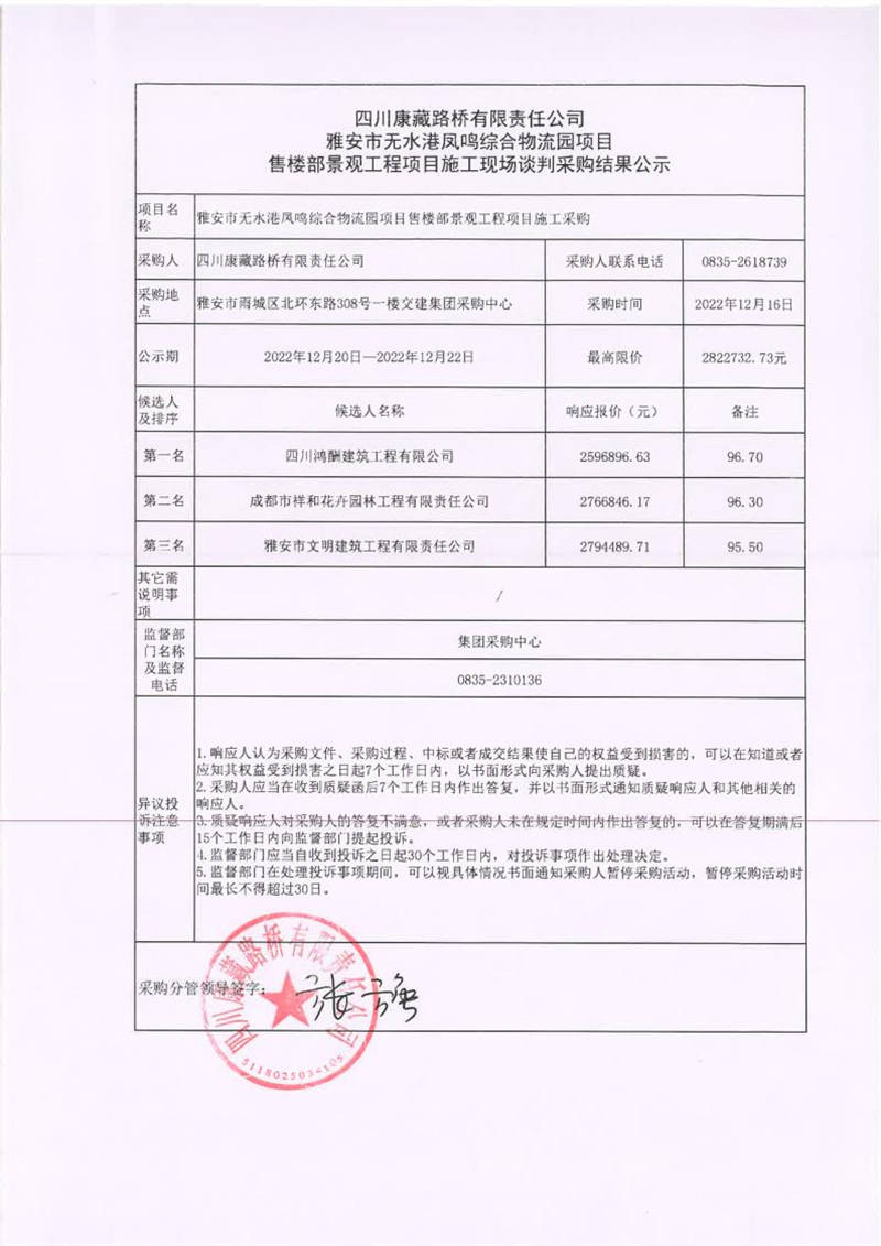 四川康藏路橋有限責(zé)任公司雅安市無水港鳳鳴綜合物流園項目售樓部景觀工程施工現(xiàn)場談判采購結(jié)果公示