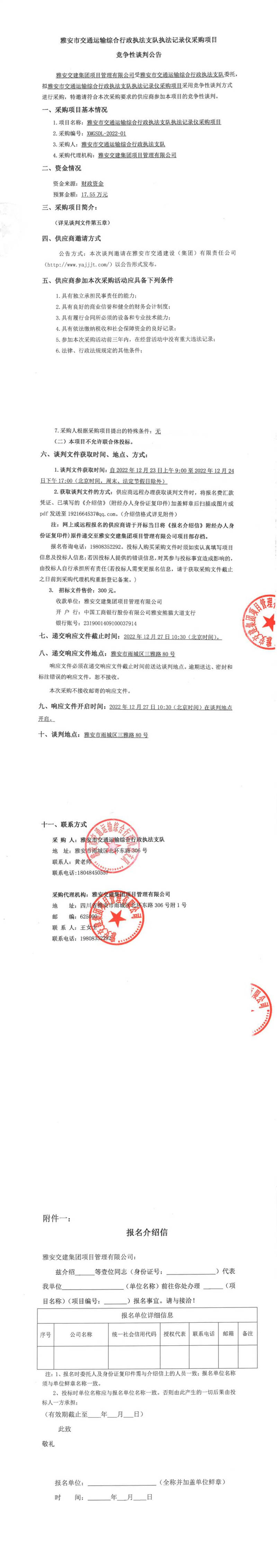 雅安交建集團(tuán)項(xiàng)目管理有限公司雅安市交通運(yùn)輸綜合行政執(zhí)法支隊(duì)執(zhí)法記錄儀采購(gòu)項(xiàng)目競(jìng)爭(zhēng)性談判公告