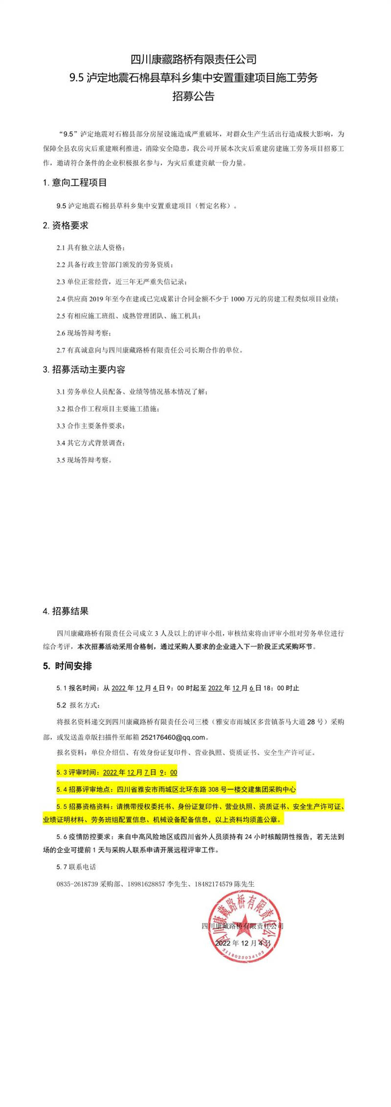 四川康藏路橋有限責(zé)任公司9.5瀘定地震石棉縣草科鄉(xiāng)集中安置重建項(xiàng)目施工勞務(wù)招募公告