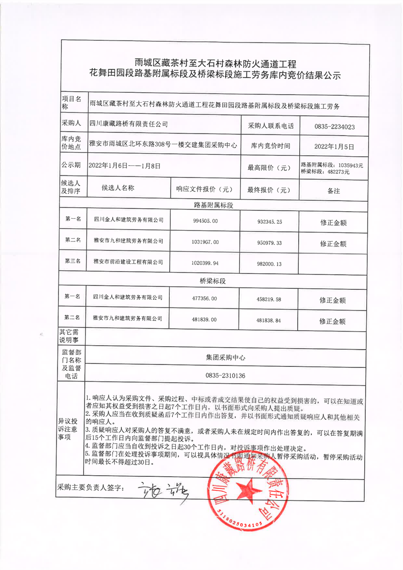 四川康藏路橋有限責任公司雨城雨城區(qū)藏茶村至大石村森林防火通道工程花舞田園段路基附屬標段及橋梁標段施工勞務庫內競價結果公示