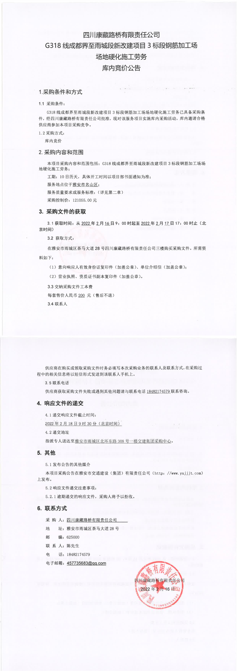 四川康藏路橋有限責任公司G318線成都界至雨城段新改建項目3標段鋼筋加工場場地硬化施工勞務庫內競價公告