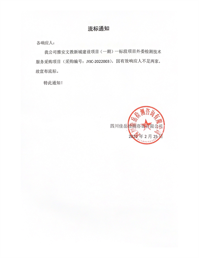 四川佳岳檢測(cè)咨詢有限公司雅安文教新城建設(shè)項(xiàng)目(一期)一標(biāo)段項(xiàng)目外委檢測(cè)技術(shù)服務(wù)采購(gòu)項(xiàng)目流標(biāo)通知