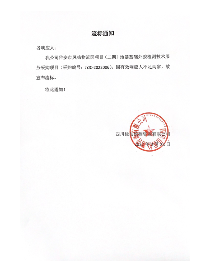 四川佳岳檢測咨詢有限公司雅安市鳳鳴物流園項目(二期)地基基礎外委檢測技術服務采購項目流標通知