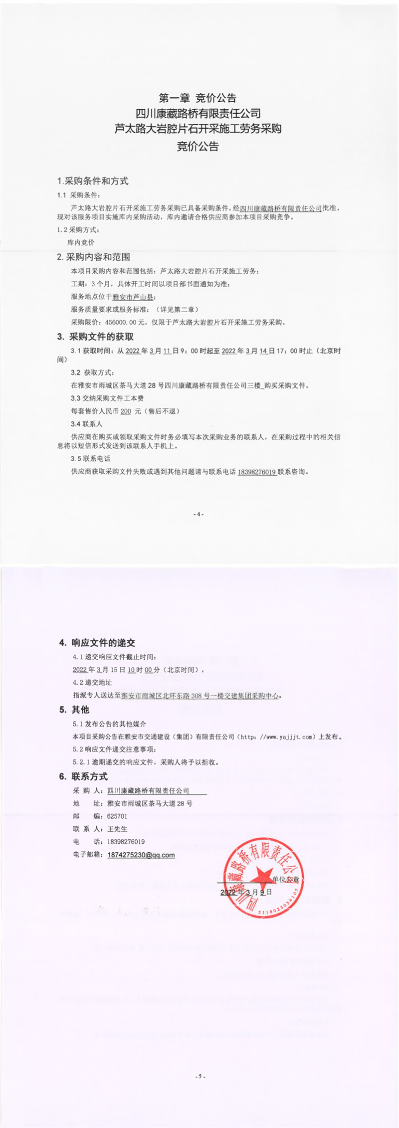 四川康藏路橋有限責(zé)任公司蘆太路大巖腔片石開采施工勞務(wù)采購競(jìng)價(jià)公告