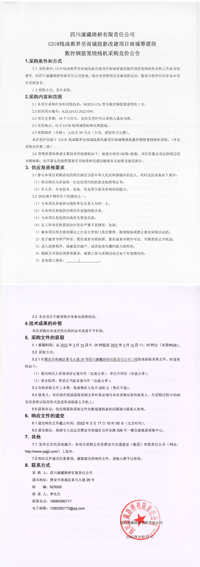 四川康藏路橋有限責(zé)任公司G318線成都界至雨城段新改建項(xiàng)目雨城籌建段數(shù)控鋼筋籠繞線機(jī)采購競價(jià)公告