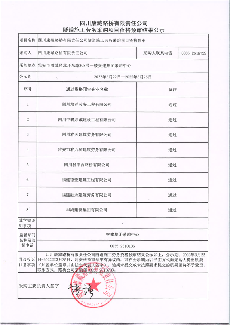 四川康藏路橋有限責(zé)任公司隧道施工勞務(wù)采購項(xiàng)目資格預(yù)審結(jié)果公示