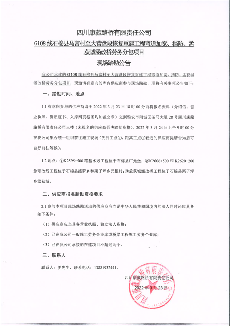 四川康藏路橋有限責任公司G108線石棉縣馬富村至大營盤段恢復重建工程彎道加寬、擋防、孟獲城涵改橋勞務分包項目現(xiàn)場踏勘公告