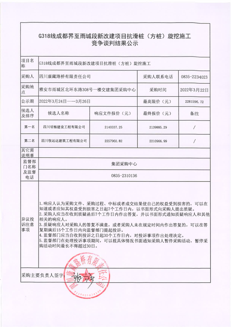 四川康藏路橋有限責(zé)任公司G318線成都界至雨城段新改建項目抗滑樁(方樁)旋挖施工競爭談判結(jié)果公示
