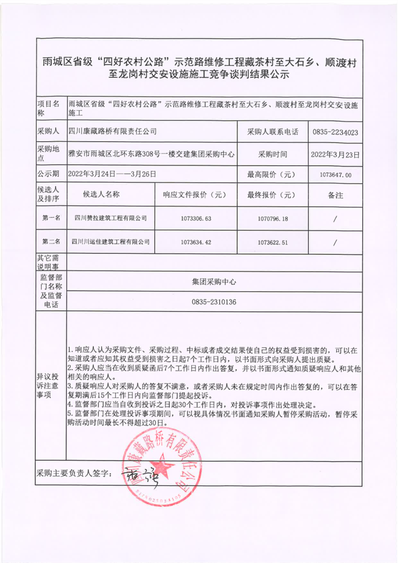 四川康藏路橋有限責(zé)任公司雨城區(qū)省級(jí)“四好農(nóng)村公路”示范路維修工程藏茶村至大石鄉(xiāng)、順渡村至龍崗村交安設(shè)施施工競(jìng)爭談判結(jié)果公示