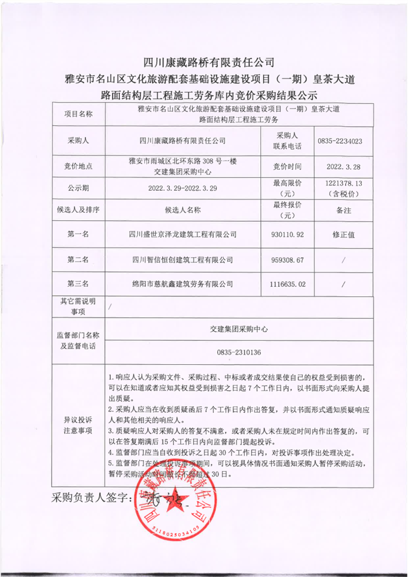 四川康藏路橋有限責任公司雅安市名山區(qū)文化旅游配套基礎(chǔ)設(shè)施建設(shè)項目(一期)路面結(jié)構(gòu)層工程施工勞務(wù)庫內(nèi)競價采購結(jié)果公示