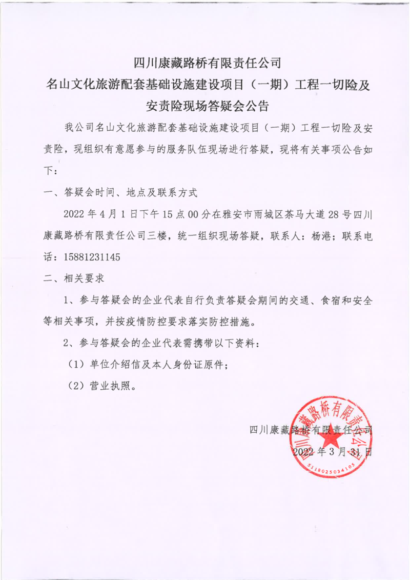 四川康藏路橋有限責任公司名山文化旅游配套基礎設施建設項目(一期)工程一切險及安責險現場答疑會公告