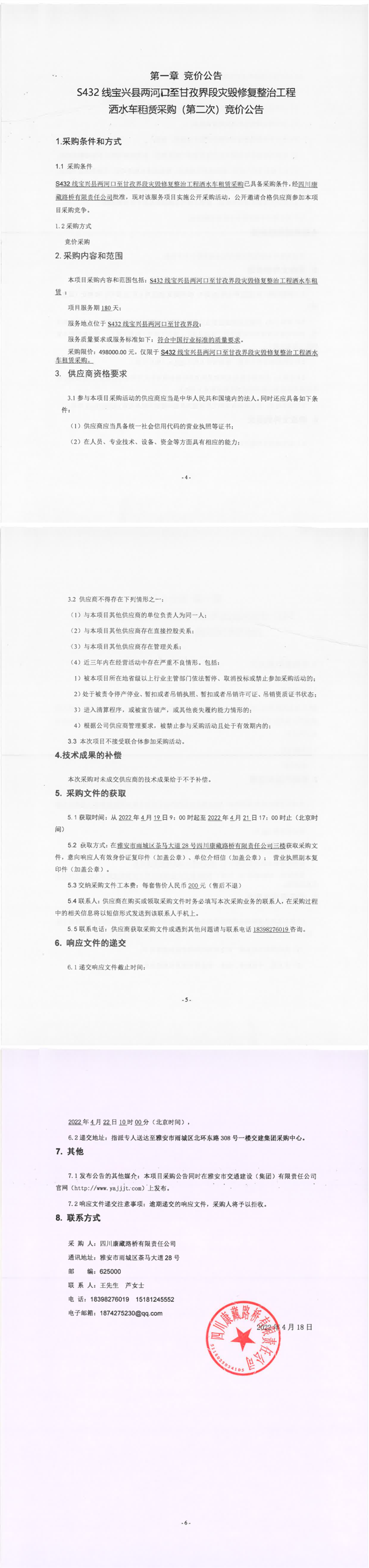 四川康藏路橋有限責任公司S432線寶興縣兩河口至甘孜界段災(zāi)毀修復整治工程灑水車租賃采購(第二次)競價公告