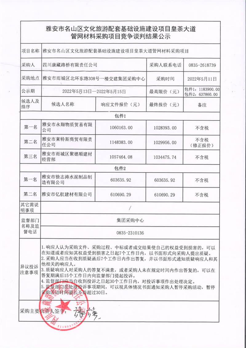 四川康藏路橋有限責(zé)任公司雅安市名山區(qū)文化旅游配套基礎(chǔ)設(shè)施建設(shè)項(xiàng)目皇茶大道管網(wǎng)材料采購項(xiàng)目競(jìng)爭(zhēng)談判結(jié)果公示