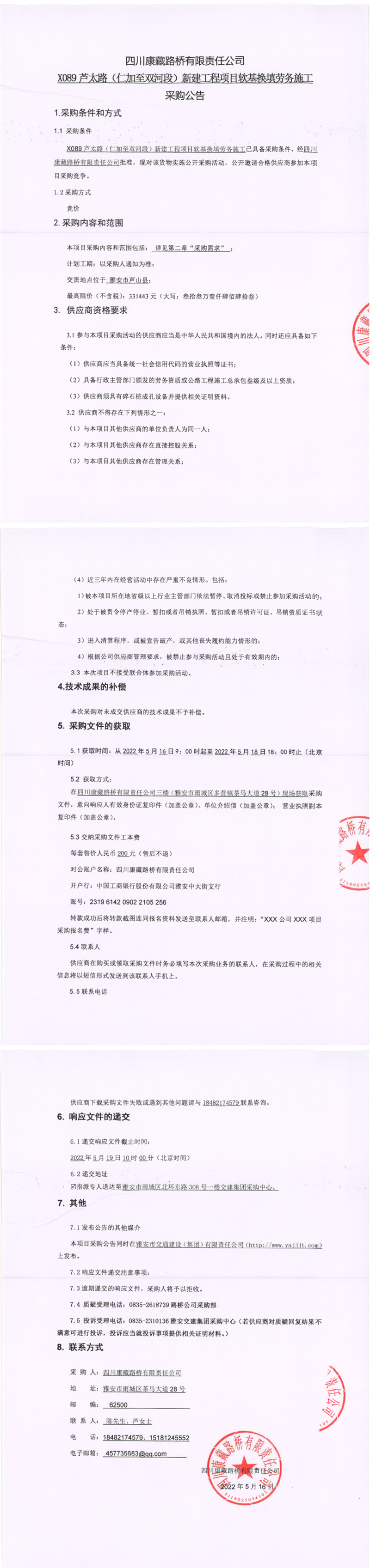 四川康藏路橋有限責(zé)任公司X089蘆太路(仁加至雙河段)新建工程項(xiàng)目軟基換填勞務(wù)施工采購公告