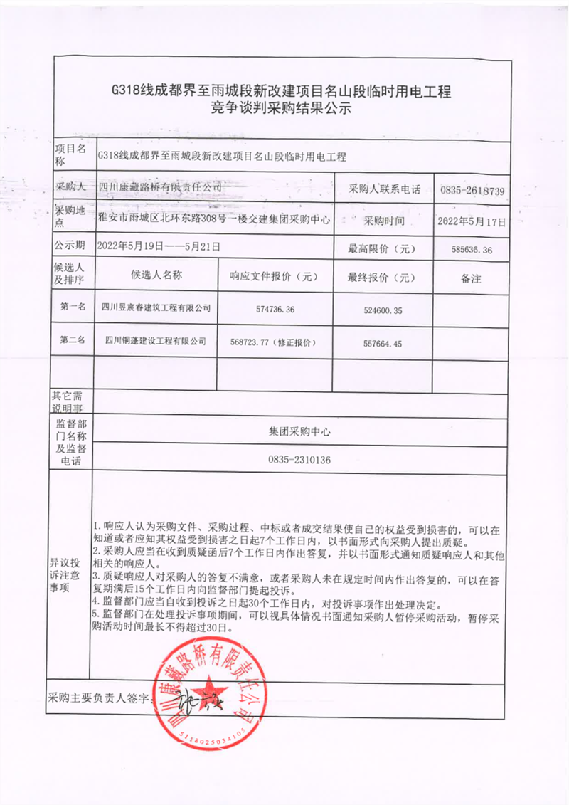 四川康藏路橋有限責任公司G318線成都界至雨城段新改建項目名山段臨時用電工程競爭談判采購結果公示
