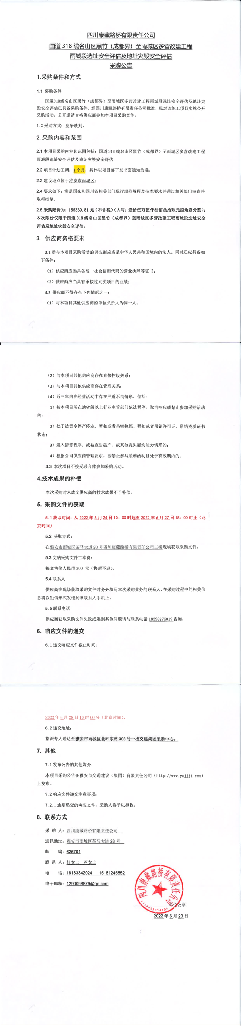 四川康藏路橋有限責(zé)任公司國道318名山區(qū)黑竹(成都界)至雨城區(qū)多營段改建工程雨城段選址安全評估及地址災(zāi)毀安全評估采購公告