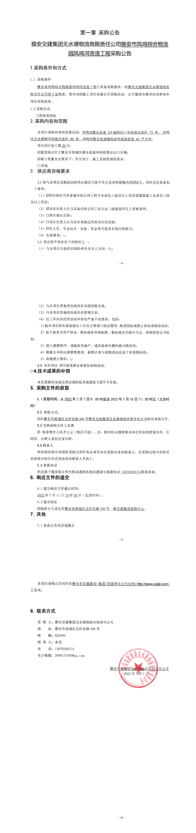 雅安交建集團(tuán)無(wú)水港物流有限責(zé)任公司雅安市鳳鳴綜合物流園鳳鳴河改造工程采購(gòu)公告