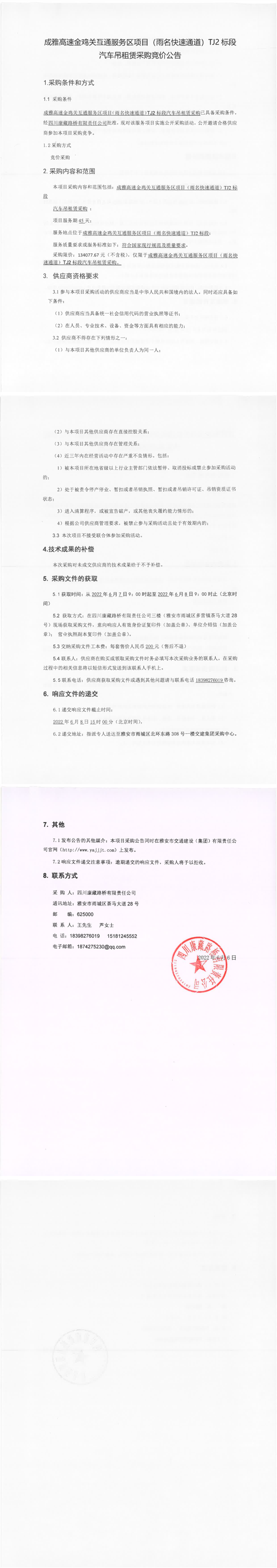 四川康藏路橋有限責(zé)任公司成雅高速金雞關(guān)互通服務(wù)區(qū)項目(雨名快速通道)TJ2標(biāo)段汽車吊租賃采購競價公告