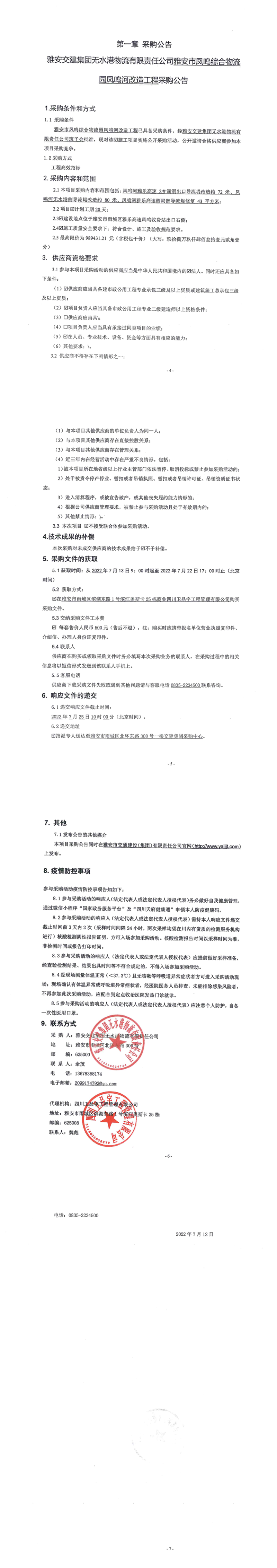 雅安交建集團(tuán)無(wú)水港物流有限責(zé)任公司雅安市鳳鳴綜合物流園鳳鳴河改造工程采購(gòu)公告