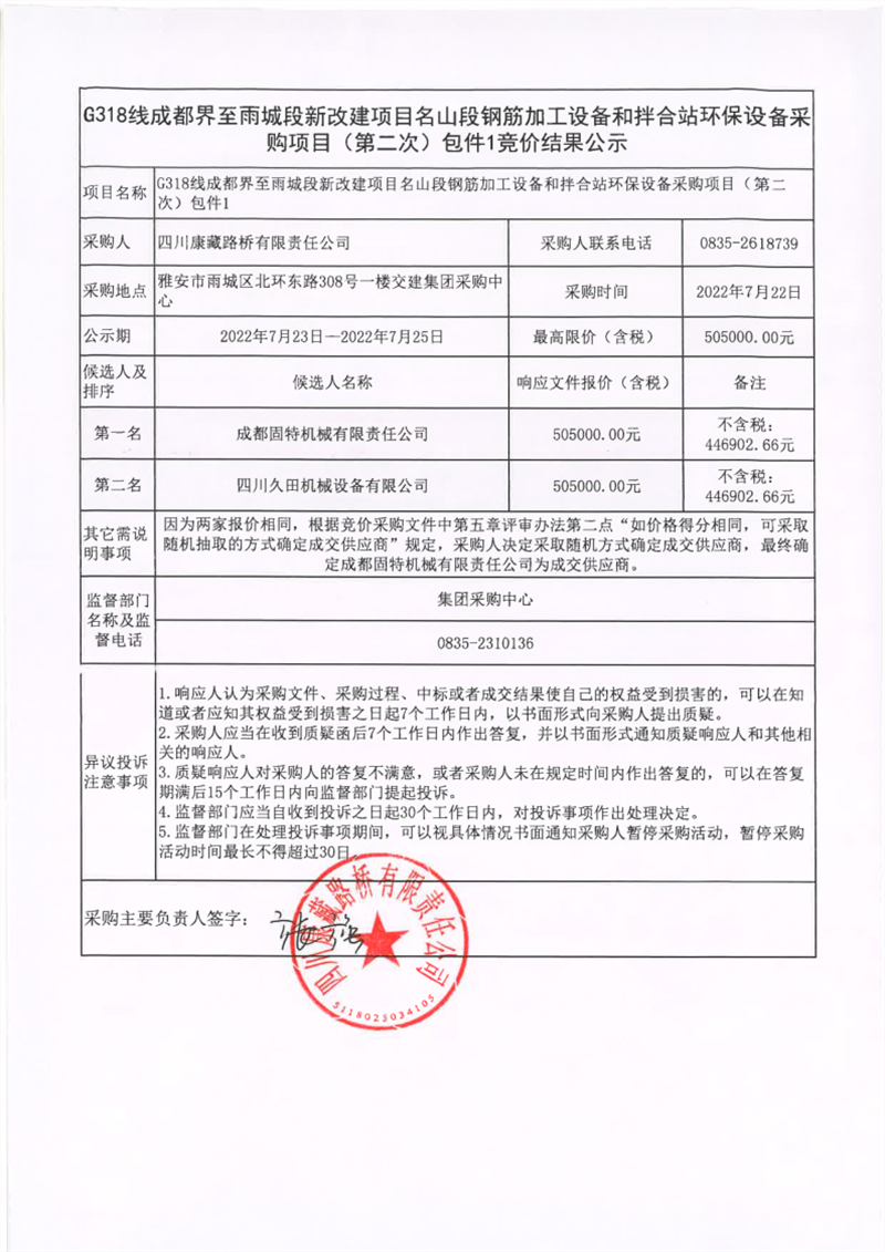 四川康藏路橋有限責任公司G318線成都界至雨城段新改建項目名山段鋼筋加工設備和拌合站環(huán)保設備采購項目(第二次)包件1競價結(jié)果公示