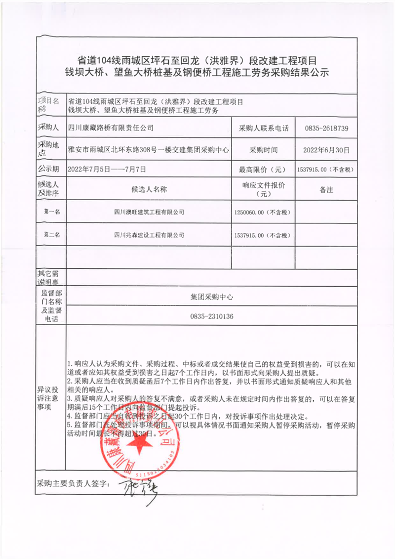 四川康藏路橋有限責(zé)任公司省道104線(xiàn)雨城區(qū)坪石至回龍(洪雅界)段改建工程項(xiàng)目錢(qián)壩大橋、望魚(yú)大橋樁基及鋼便橋工程施工勞務(wù)采購(gòu)結(jié)果公示
