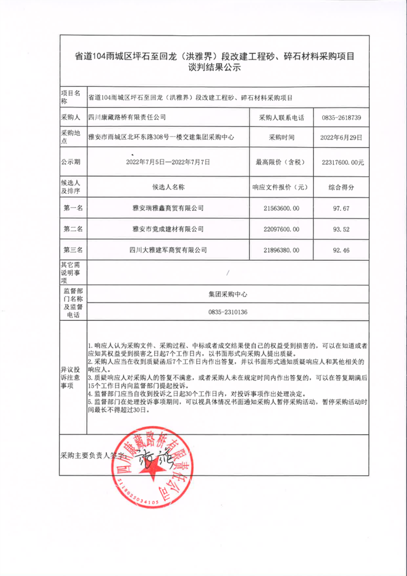 四川康藏路橋有限責(zé)任公司省道104雨城區(qū)坪石至回龍(洪雅界)段改建工程砂、碎石材料采購(gòu)項(xiàng)目談判結(jié)果公示