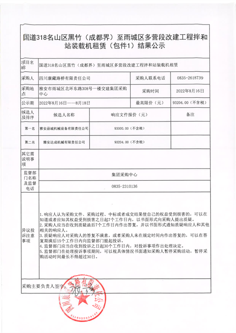 四川康藏路橋有限責任公司國道318名山區(qū)黑竹(成都界)至雨城區(qū)多營段改建工程拌和站裝載機租賃(包件1)結果公示