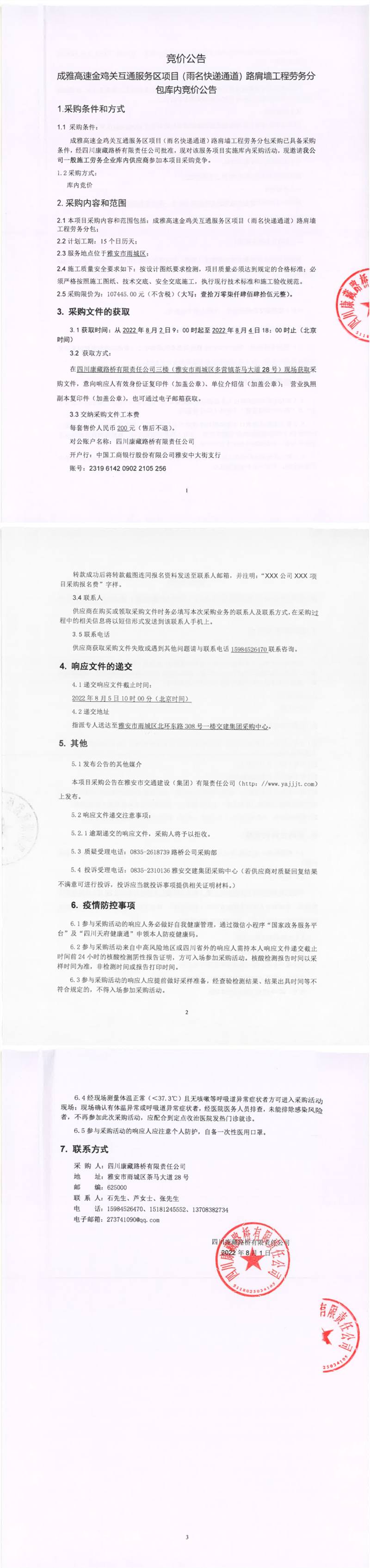 四川康藏路橋有限責任公司成雅高速金雞關(guān)互通服務(wù)區(qū)項目(雨名快速通道)路肩墻工程勞務(wù)分包庫內(nèi)競價公告