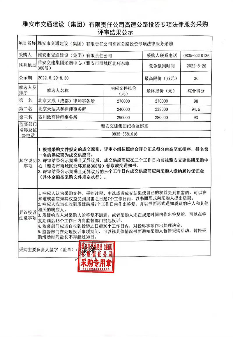 雅安市交通建設(集團)有限責任公司高速公路投資專項法律服務采購評審結(jié)果公示
