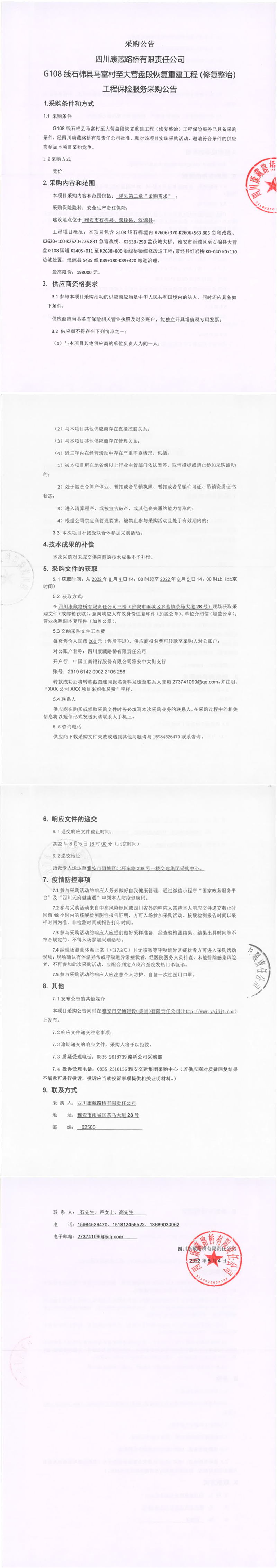 四川康藏路橋有限責任公司G108線石棉縣馬富村至大營盤段恢復(fù)重建工程(修復(fù)整治)工程保險服務(wù)采購公告