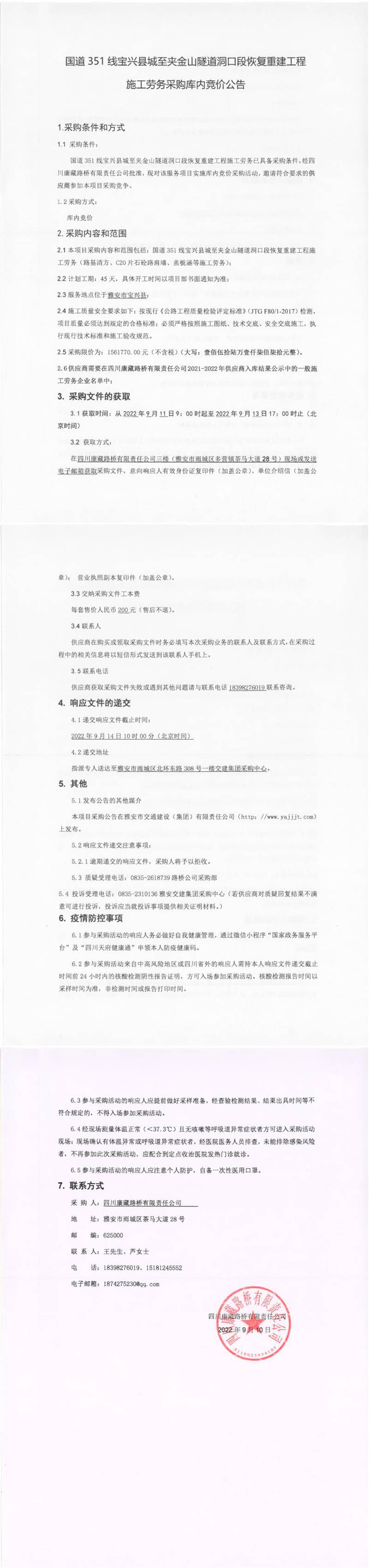 四川康藏路橋有限責任公司國道351線寶興縣城至夾金山隧道洞口段恢復重建工程施工勞務采購庫內競價公告