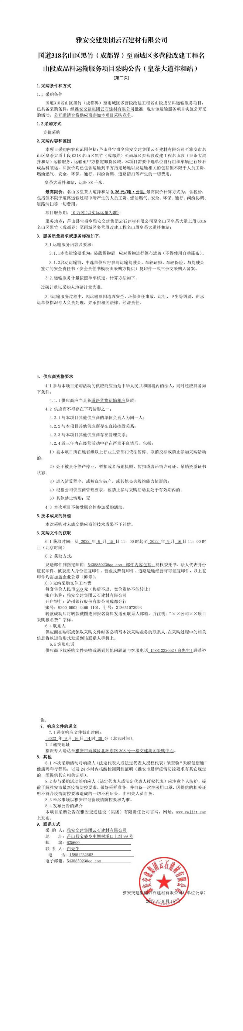 雅安交建集團(tuán)云石建材有限公司國道318名山區(qū)黑竹(成都界)至雨城區(qū)多營段改建工程名山段成品料運輸服務(wù)項目采購公告(皇茶大道拌和站)