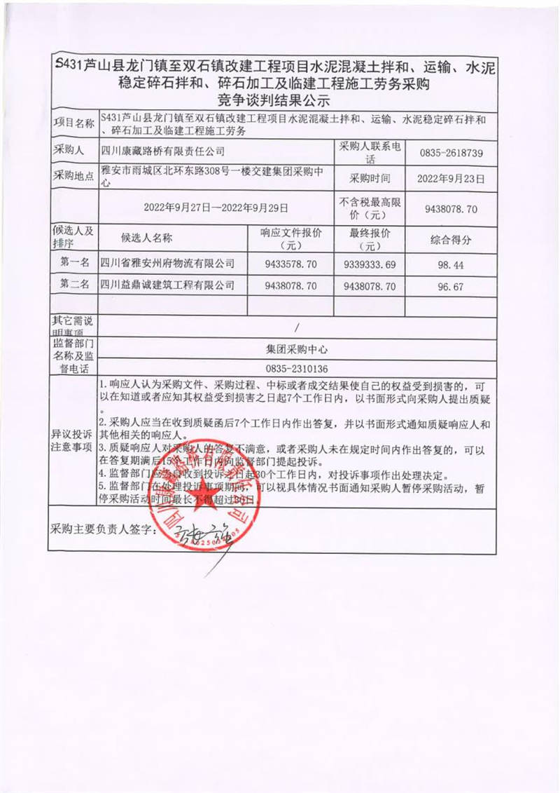 四川康藏路橋有限責(zé)任公司S431蘆山縣龍門鎮(zhèn)至雙石鎮(zhèn)改建工程項(xiàng)目水泥混凝土拌和、運(yùn)輸、水泥穩(wěn)定碎石拌和、碎石加工及臨建工程施工勞務(wù)采購競(jìng)爭(zhēng)談判結(jié)果公示