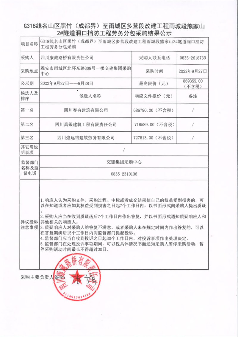 四川康藏路橋有限責(zé)任公司G318線名山區(qū)黑竹(成都界)至雨城區(qū)多營(yíng)段改建工程雨城段熊家山2#隧道洞口擋防工程勞務(wù)分包采購(gòu)結(jié)果公示
