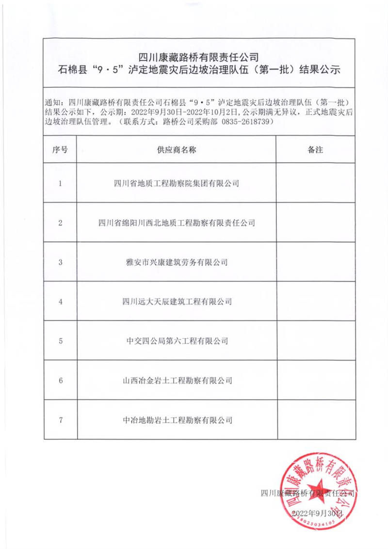 四川康藏路橋有限責任公司石棉縣“9.5”瀘定地震災后邊坡治理隊伍(第一批)結果公示