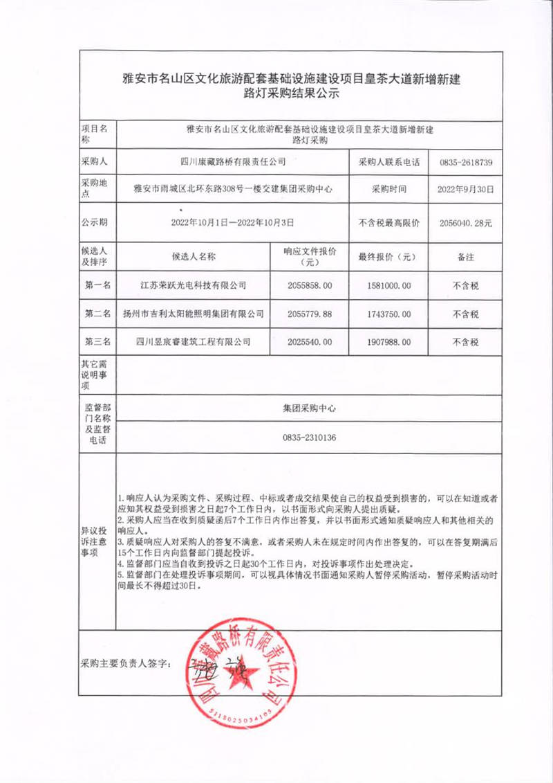 四川康藏路橋有限責任公司雅安市名山區(qū)文化旅游配套基礎設施建設項目皇茶大道新增新建路燈采購結(jié)果公示