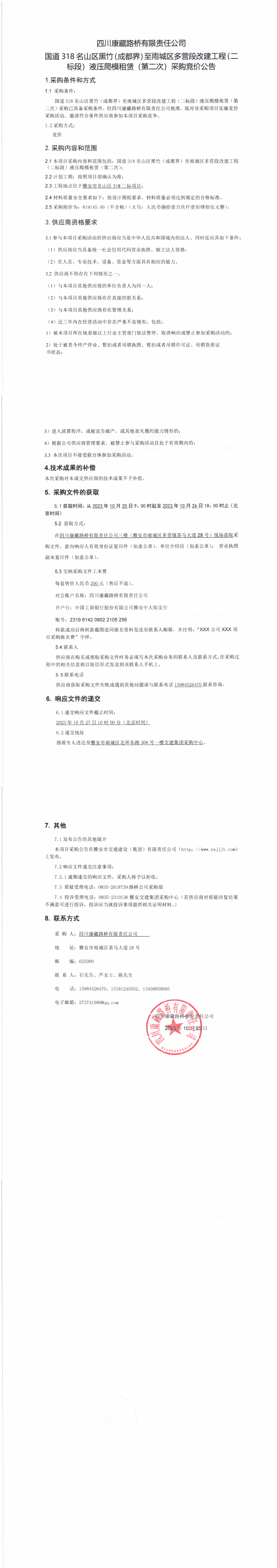 四川康藏路橋有限責(zé)任公司國(guó)道318名山區(qū)黑竹(成都界)至雨城區(qū)多營(yíng)段改建工程二標(biāo)段液壓爬模租賃(第二次)采購競(jìng)價(jià)公告