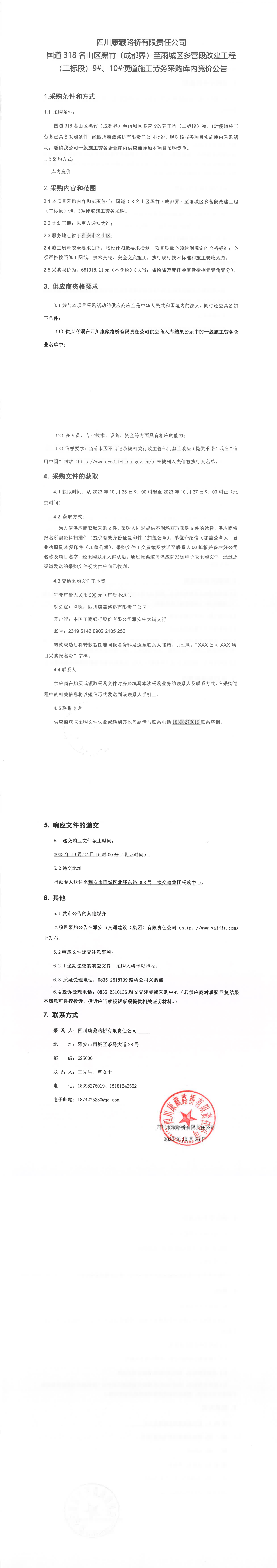 四川康藏路橋有限責任公司國道318名山區(qū)黑竹(成都界)至雨城區(qū)多營段改建工程(二標段)9#、10#便道施工勞務(wù)采購庫內(nèi)競價公告
