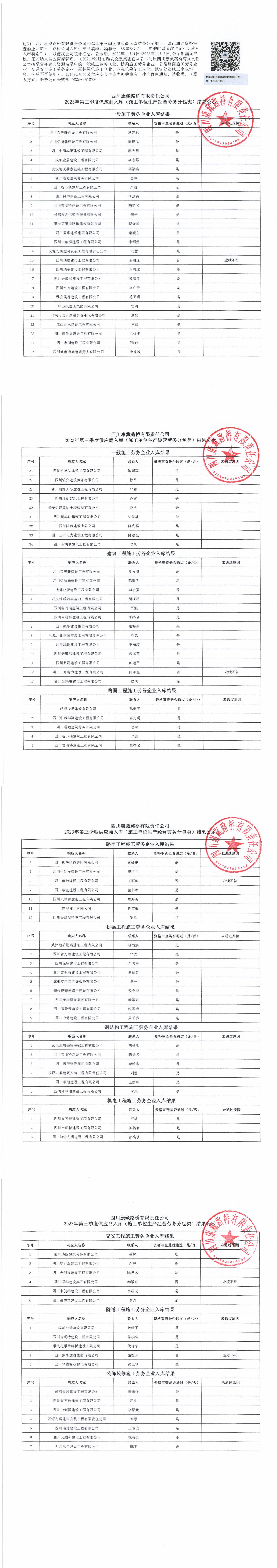 四川康藏路橋有限責任公司2023年第三季度供應商入庫(施工單位生產(chǎn)經(jīng)營勞務分包類)結(jié)果公示