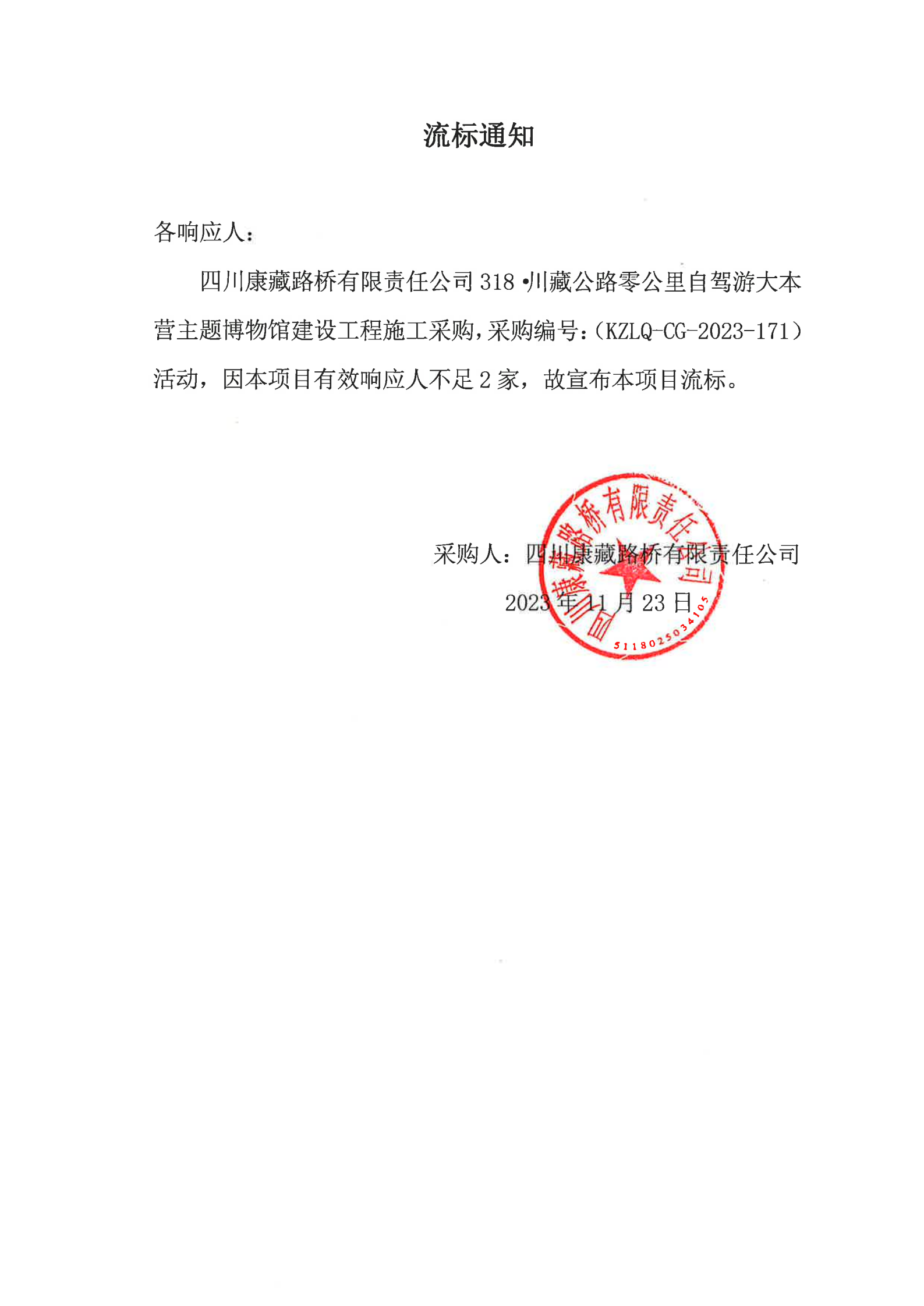 四川康藏路橋有限責(zé)任公司318·川藏公路零公里自駕游大本營主題博物館建設(shè)工程施工采購流標(biāo)通知