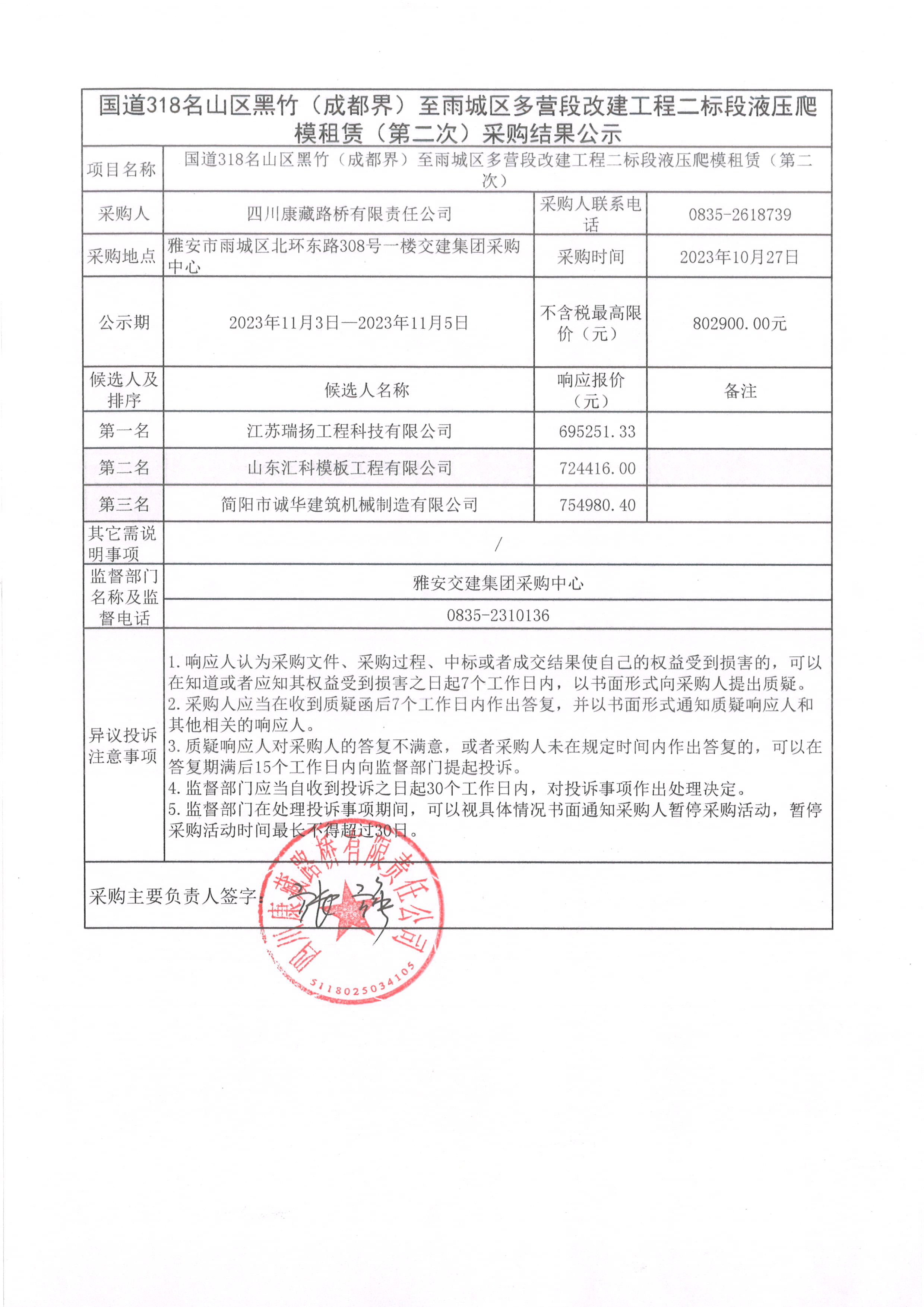 四川康藏路橋有限責(zé)任公司國(guó)道318名山區(qū)黑竹(成都界)至雨城區(qū)多營(yíng)段改建工程二標(biāo)段液壓爬模租賃(第二次)采購結(jié)果公示