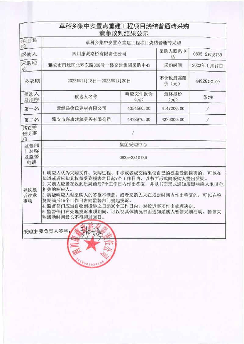 四川康藏路橋有限責(zé)任公司草科鄉(xiāng)集中安置點(diǎn)重建工程項(xiàng)目燒結(jié)普通磚采購競(jìng)爭談判結(jié)果公示