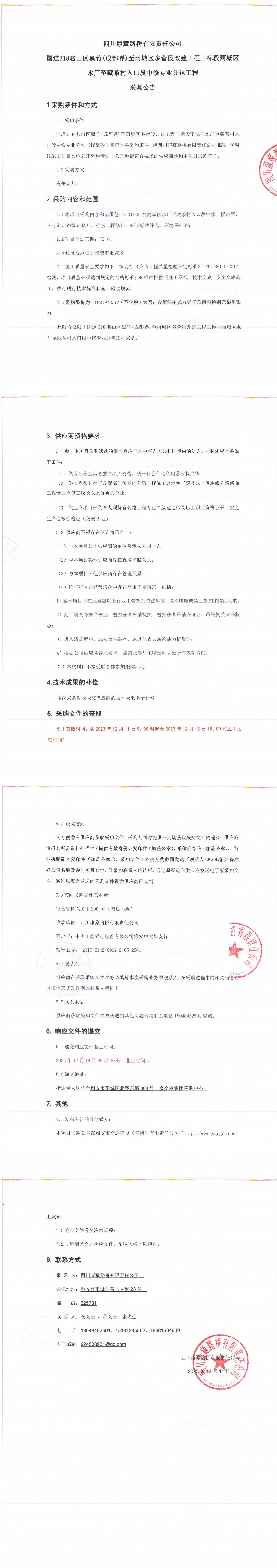四川康藏路橋有限責(zé)任公司國道318名山區(qū)黑竹(成都界)至雨城區(qū)多營段改建工程三標段雨城區(qū)水廠至藏茶村入口段中修專業(yè)分包工程采購公告
